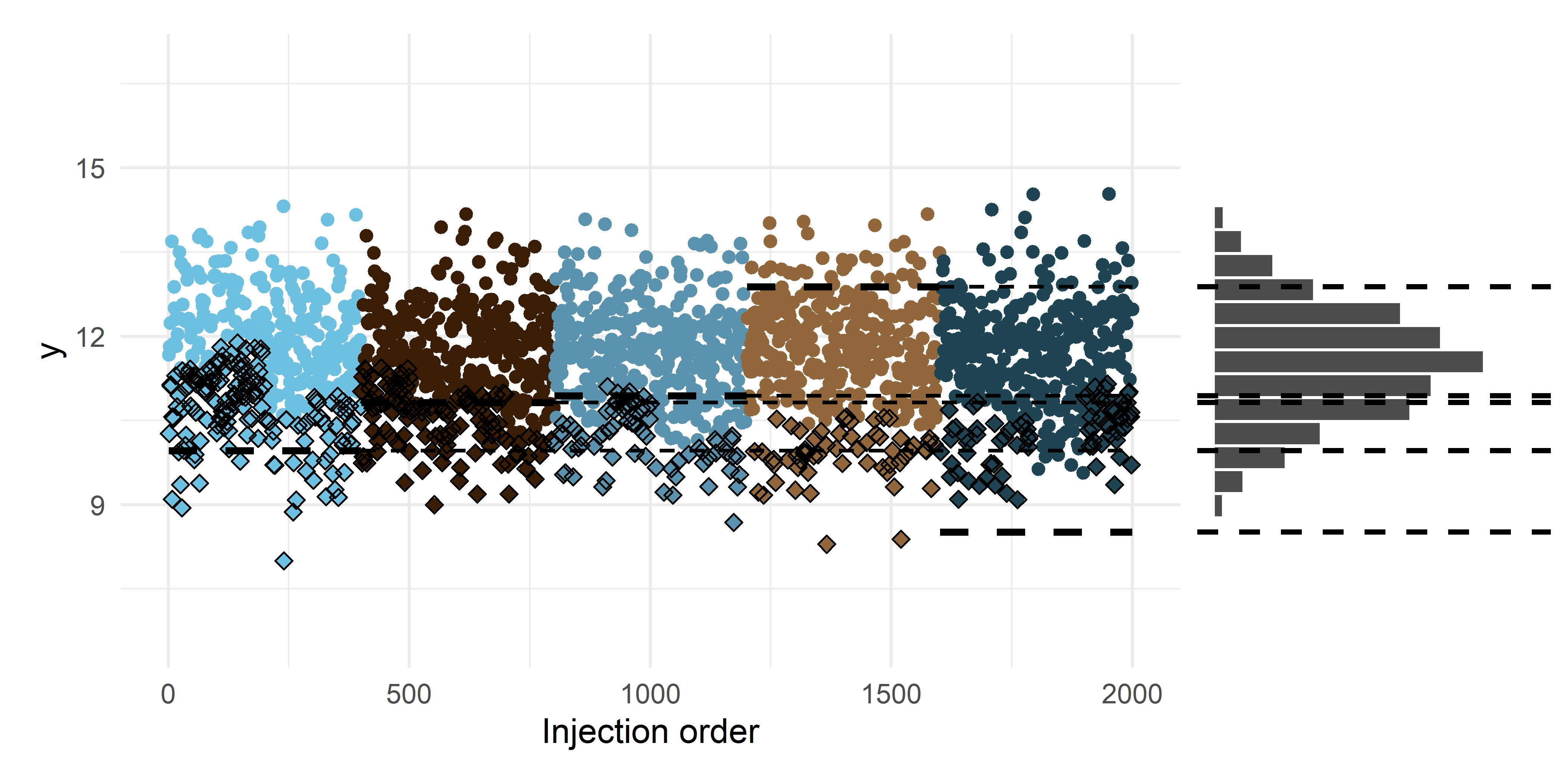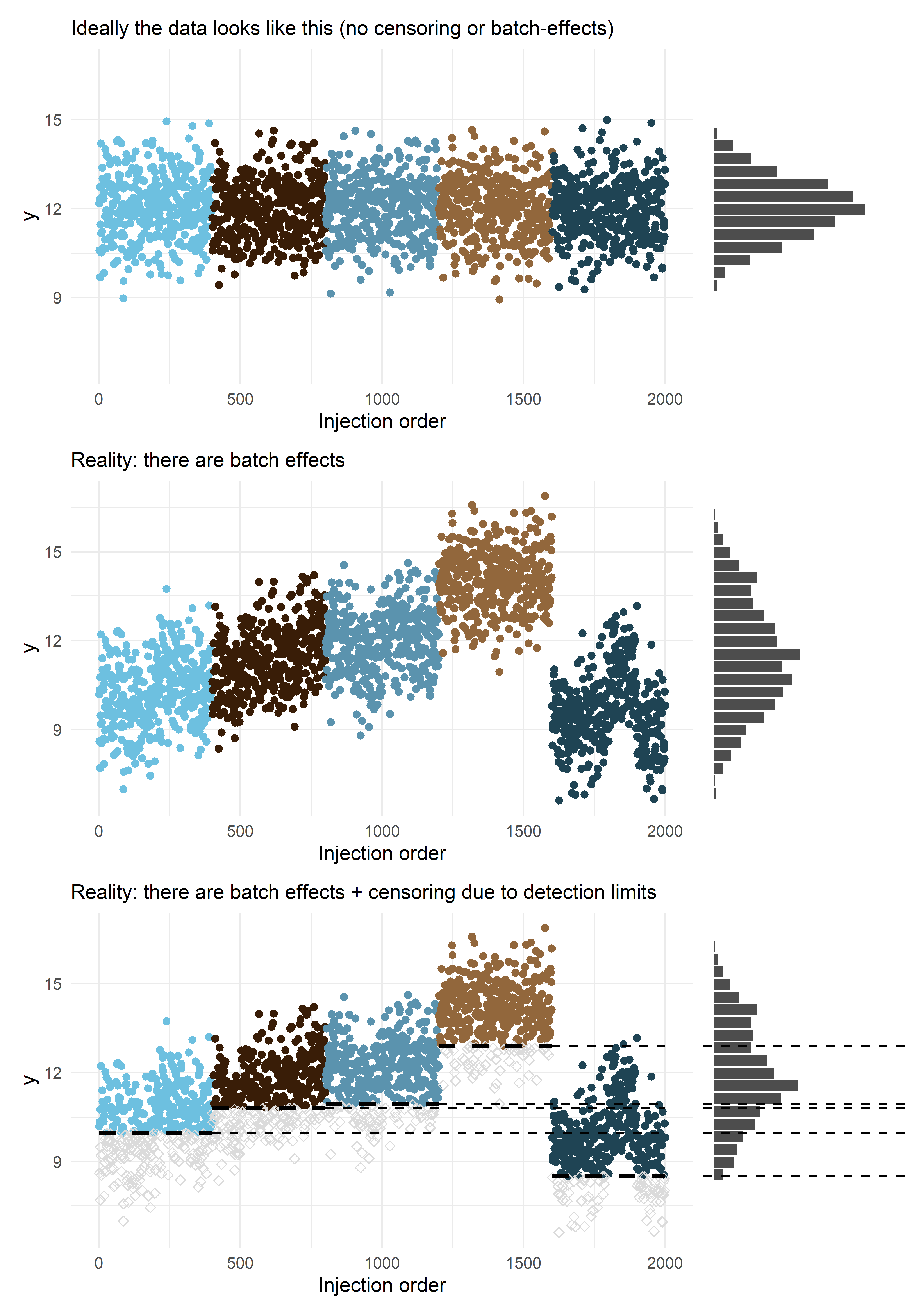 The plot below shows the technical variation (the different colors correspond to different batches) and the left-censored nature of the (untargeted) metabolic data. The data is left-censored because our instruments don’t have unlimited sensitivity. Due to left-censoring (dashed line), we observe only part of the distribution. Without the variation introduced by the different batches and plates the distribution would be much narrower. It’s also interesting to see that you can have an apparent drift over time that’s just the consequence of random variation between batches and not a separate linear trend.