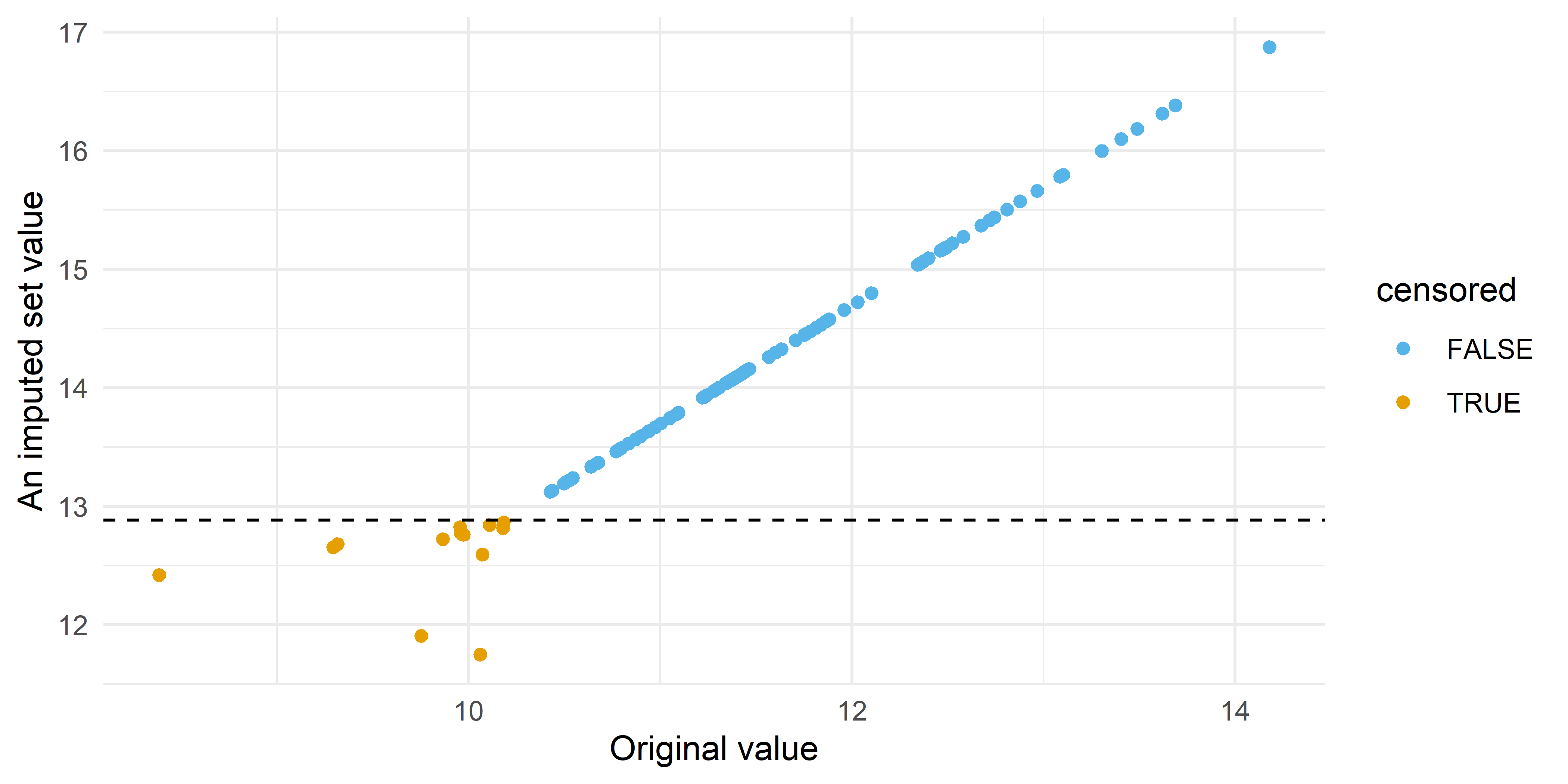 Another way around this – that is potentially attractive to labs if they also want to provide a batch adjusted dataset – is to slightly change our approach. We still take the intertwined nature of nondetects and batch effects into account by fitting the same statistical model. But contrary to what I described before, we do not impute. We only remove the technical variation by subtracting the technical variation terms from the observed data. We leave the imputation to the analyst. That part will still be bespoke. But the analyst can now just focus on creating a congenial imputation model like they have probably done before for more common epidemiological data. They do not need to worry about the technical variation6. They only need a mice implementation of the left-censored imputation model from Lubin et al. (2004) and they are ready to go! I think such a two-step approach is less elegant and maybe less statistically efficient but it meets a need of many labs and analysts and I think it’s a marked improvement over what they usually do.